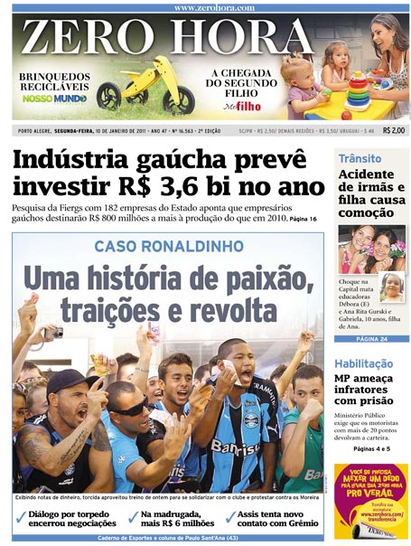 Em seu site oficial Ronaldinho disse que se fosse por sua vontade já estaria com a camisa do Grêmio, mesmo ganhando menos. Mentira. Primeira vez que vi o dentuço se posicionando e manifestando uma opinião e ela é totalmente mentirosa. E ainda nos tira para bobos. O Milan já tinha liberado, e os irmãos Assis tinham três propostas na gaveta: Grêmio, Flamengo e Palmeiras. Em todas ganhariam dinheiro. Ou seja, a decisão era deles sim. Nada o impediria de jogar no Grêmio, pois a proposta existiu e o contrato estava pronto. Ele não vai jogar no Grêmio porque não quer, pois preferiram uns pilas a mais do Flamengo, quiseram exigir mundos e fundos do “clube do coração”, quiseram abrir leilão. Não vai jogar no Tricolor porque não está dando a mínima para o clube e sua torcida, como, aliás, nunca deu.